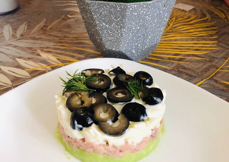 - 🥚 Остудить, с двух яиц, удалить желток, и нарезать, мелкими кубиками, маслины нарезать на колечки. В йогурт добавить горчицу, соль щепотку, все смешиваем. Соус готов. Приступаем к сборке салата. 1)слоем идёт авокадо, 2) тунец.3) белок яичный.4) соус.5 ) маслины..