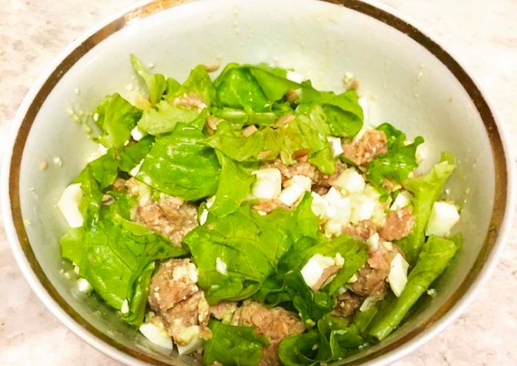 - Салат нарвать руками, яйца отварить, почистить и нарезать крупными кубиками, тунца размять вилкой, все перемешать и заправить маслом из банки тунца. Салат готов, быстро и вкусно..