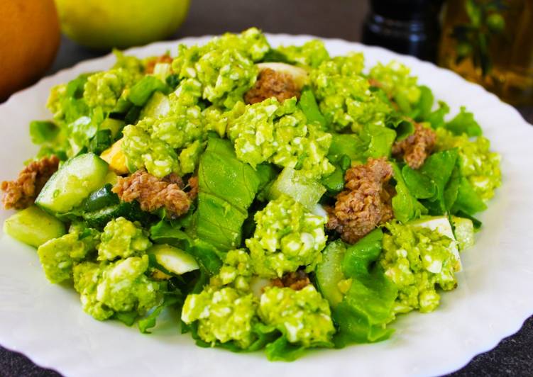 - Листы салата, зеленый лук, огурец и отварные яйца солим и перчим (по вкусу), добавляем подсолнечное масло и перемешиваем. И выкладываем на тарелку. Сверху чайной ложкой выкладываем, тунец и пасту из авокадо и плавленого сыра..