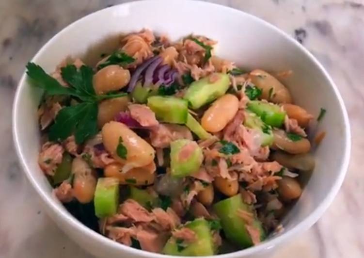 - Если фасоль не консервированная, замачиваем на ночь и отвариваем с солью. ✅Готовим заправку: В миске смешиваем оливковое масло, сок лимона, чеснок измельчённый, лук полукольцами, соль и перец. В отдельную посуду кладём фасоль, тунец крупно порезанный, огурец кубиками и заправки поливаем, всё перемешать, украсить петрушкой или базиликом и готов наш полезный салатик😋👌🙋♀️..