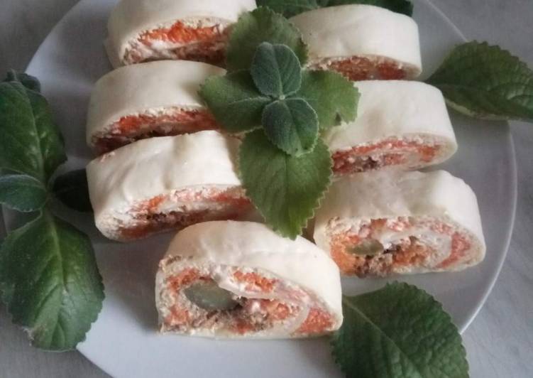 - Растапливаем в микроволновке моцареллу, сыр станет мягким и податливым. Кладем его на досочку и раскатываем в тонкий пласт. Перекладываем на пищевую пленку. Сверху на сыр выкладываем натертое яйцо. Поливаем тонкой сеточкой майонеза, на яйцо выкладываем натертую отварную морковь и также смазываем тонкой сеточкой майонеза. Затем возле края выложить консервированного тунца,на него кладем нарезанный соленый огурчик (можно свежий с болгарским перцем и зеленым луком)..