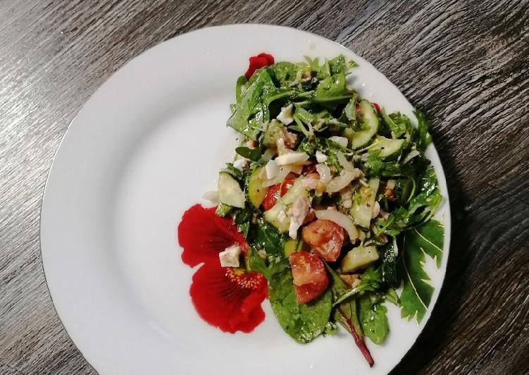 - Пока варятся яйца, нарезать огурцы, помидоры, лук, смешать с зеленью. Добавить тунец и яйца, посолить, поперчить, заправить маслом с добавлением лимонного сока..