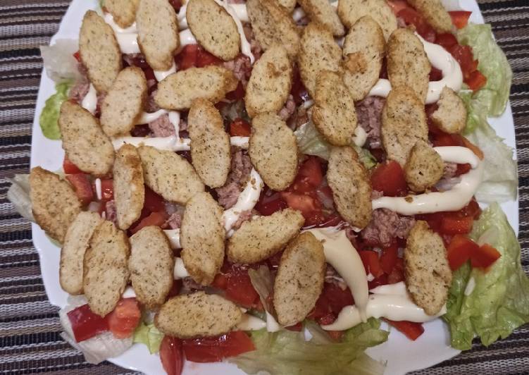 - Выкладываем слоями тунец, майонез, сухариками..