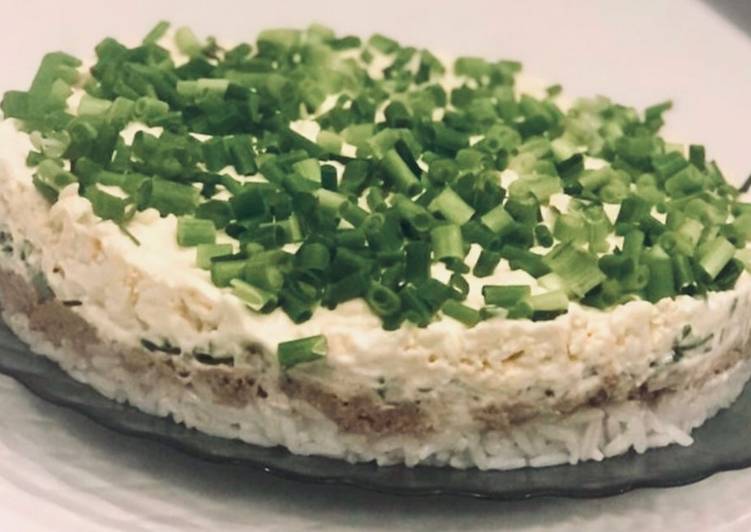 - Собираем салат. Нижний слой рис, слегка смазать майонезом..
