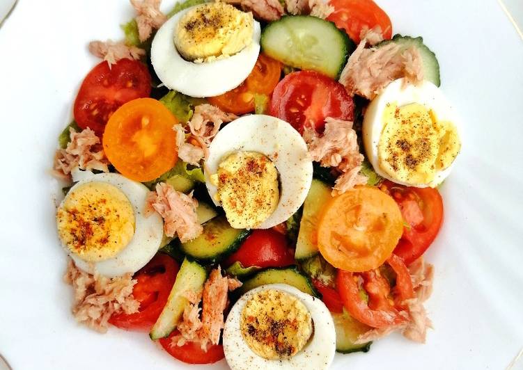 - Приготовление : Нарежьте овощи и отваренные яйца на небольшие кусочки. Листья салата порвите руками и смешайте с овощами. Посолите и заправьте оливковым маслом и соком лимона. Добавьте к салату яйцо и тунец. Яйцо по желанию приправьте молотым перцем..