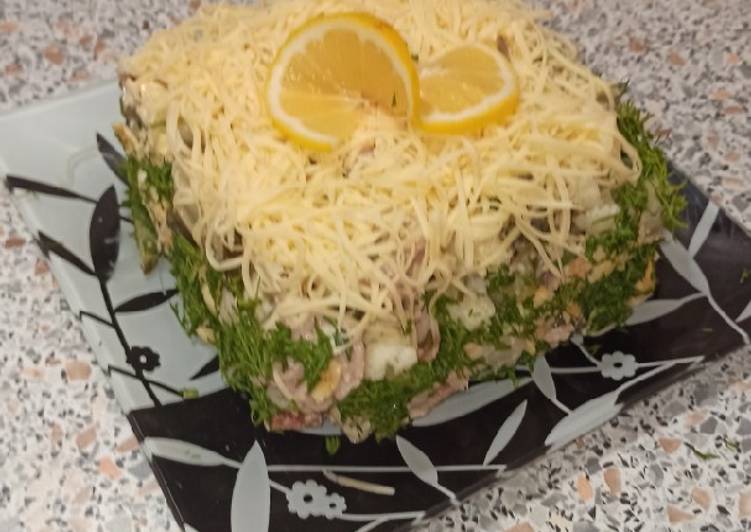 - Можно сделать слоями и каждый слой смазать заправкой. Или же все смешать, заправить и подавать..