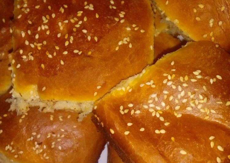 - Слепить булочки. Выложить в форму. Подходят еще 1 час. Смазать яйцом с водой. Посыпать кунжутом. Выпекать в духовке при темп. 200. Печь 15 мин..