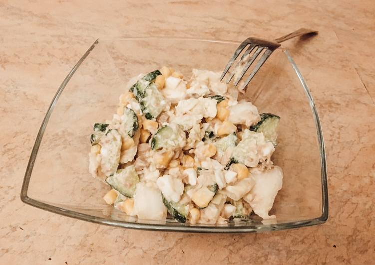 - Все смешать, добавить кукурузу и заправить йогуртом..
