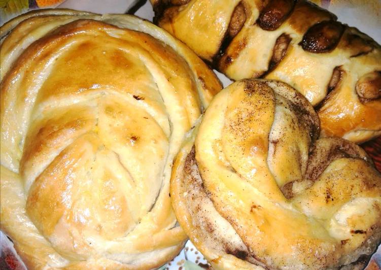 - Обминаем аккуратно тесто, отрезаем понемногу и делаем булочки. Отрезаем кусочек, делаем шар и раскатываем немного, смазываем масло, посыпаем сахаром, скатываем в рулет, разрезаем с двух сторон, не доходят до центра. И сворачиваем в форме листка. Повторяем так и с корицей..
