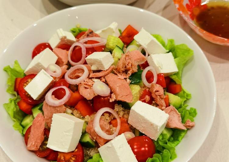 You can cook Салат из киноа, консервированного тунца, овощей и брынзы using 12 ingredients and 7 steps. Here is how you cook it.