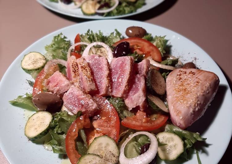 - Раскалить сковороду. Филе тунца обсушить салфеткой и обвалять в кунжуте. В сковороду наливаем немного масла и обжариваем с двух сторон на сильном огне, буквально минуту две с каждой стороны, смотрите чтобы в центре мясо оставалось красным. Быстро выкладываем его на разделочную доску и самым острым ножом нарезаем на тонкие ломтики. Выкладываем ломтики на овощи, солим и перчим. После сбрызгиваем соком лимона, оливковым маслом и соевым соусом. Подавать теплым. Приятного аппетита..