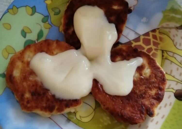 - Ложкой выкладываем небольшие комочки в муку, обваливаем, формируем сырники и обжариваем на масле с двух сторон до золотистой корочки..
