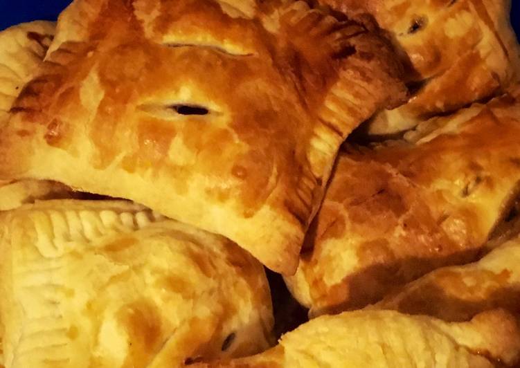 - Тесто раскатываем на тонкие прямоугольники, выкладываем по столовой ложке начинки и защипываем края. Сверху делаем небольшие надрезы..