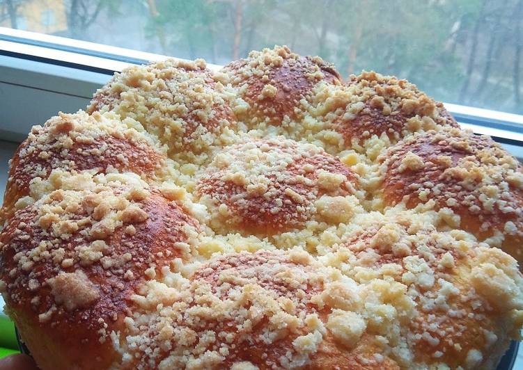 - Даём постоять тесту 1 час. Делаем крошку смешиваем муку, сахар, масло. Перетираем все в крошку. От общей массы тесто отщипываем кусочки тесто и подкатываем в шарики и кладем в форму для бисквита. Предварительно выстилаем дно формы пергаментом и смазываем всю форму сливочным маслом. Выкладываем тесто в форму. Смазываем булочки взбитым яйцо и посыпаем крошкой. Выпекаем при 180 градусах 20-30 минут..