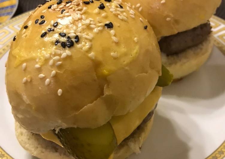 - Готовые булочки разрезать пополам. На одну половинку положить котлету. Сверху сыр, огурцы, лук и кетчуп. Накрыть другой половинкой булочки. Приятного аппетита 😋.